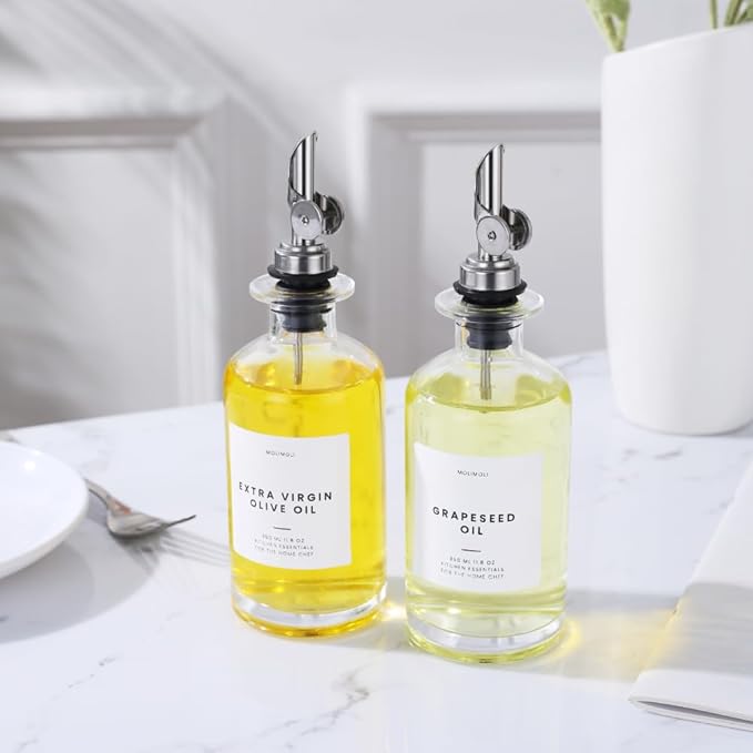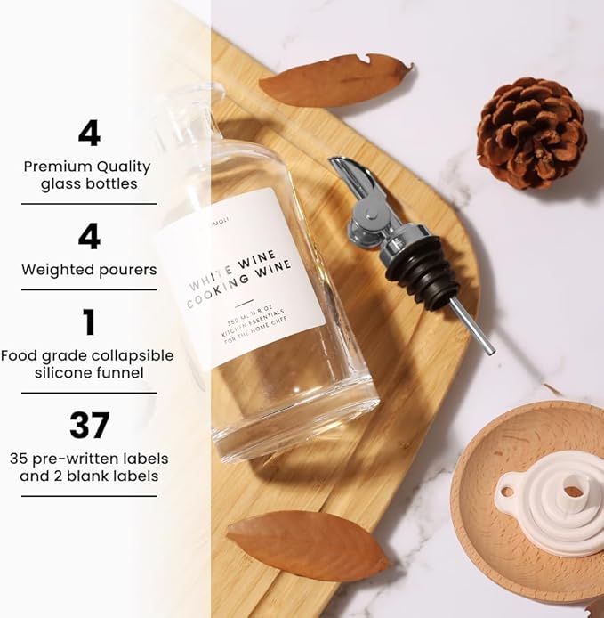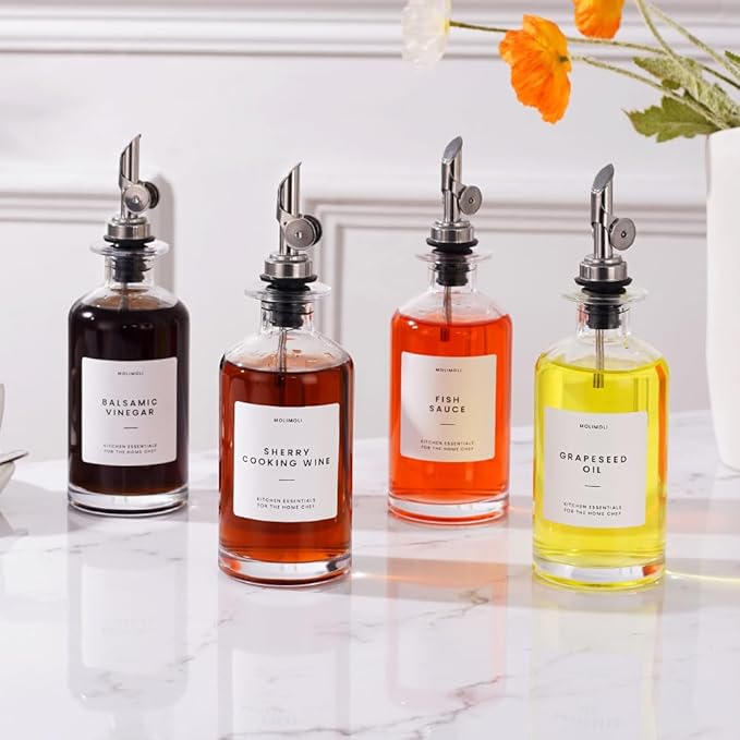 • Modern Kitchen Essential: Minimalism Inspired Cooking Oil Dispenser Bottle. This Set Includes Four High-quality 11.8 Oz (350 Ml) Glass Bottles, Four Silver Pourers, a funnel, and a 37 Label Set.