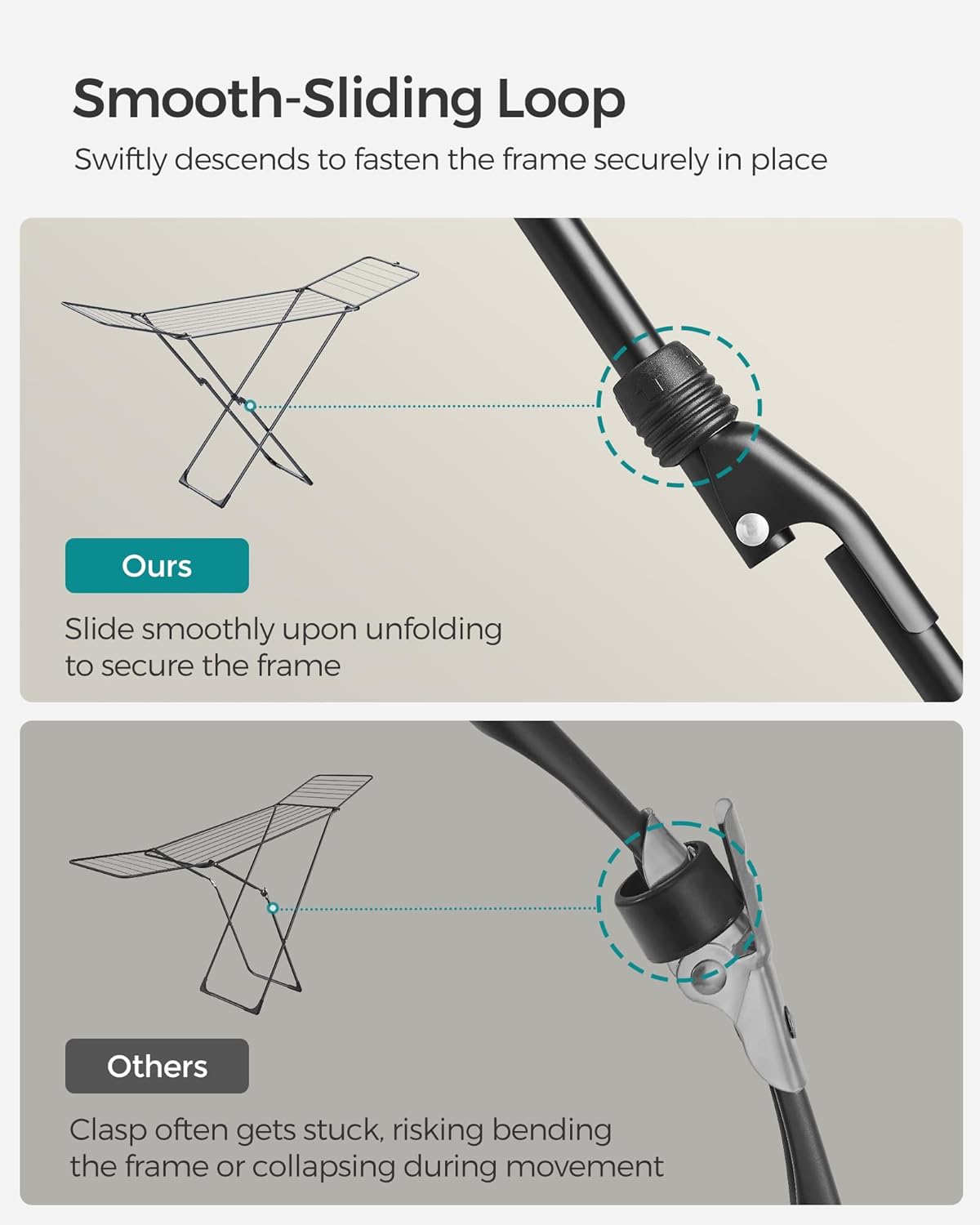 • [Thoughtful Details] This drying rack features a smooth-sliding loop, a plastic clip that keeps wings securely in place when folded, and floor-friendly plastic feet