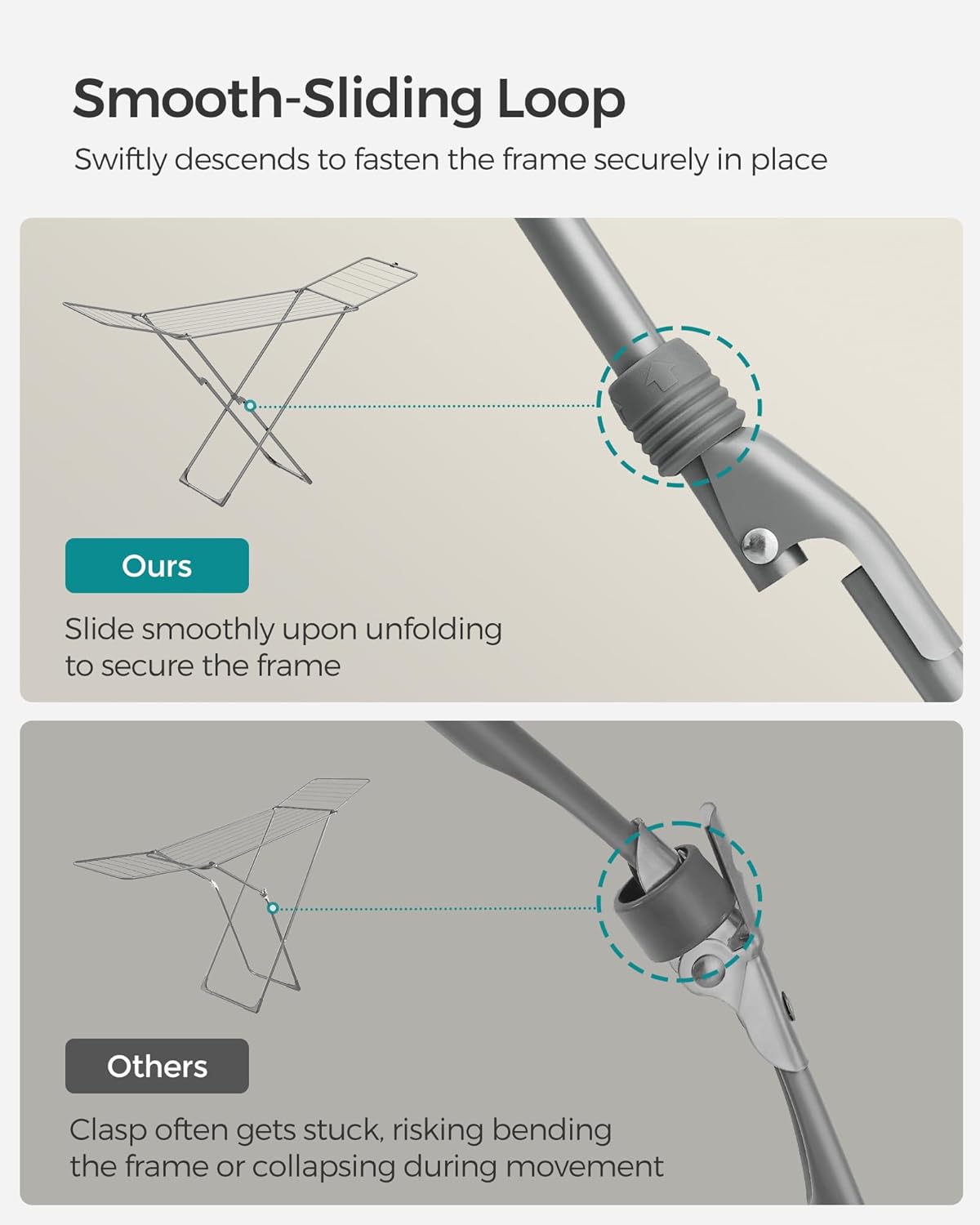 • [Thoughtful Details] This drying rack features a smooth-sliding loop, a plastic clip that keeps wings securely in place when folded, and floor-friendly plastic feet