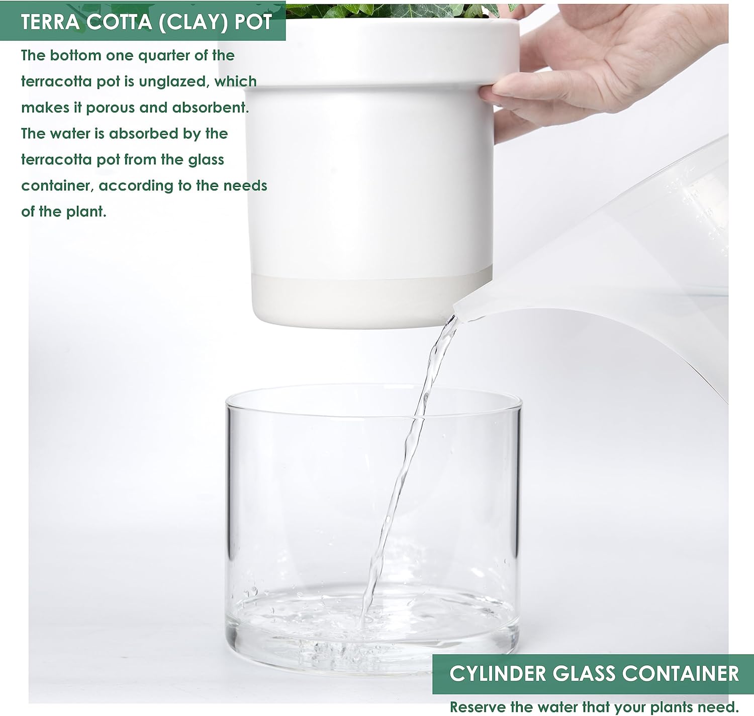 • Self-Watering System: The bottom quarter of the terracotta pot is unglazed, allowing plants to absorb water through the pot walls.