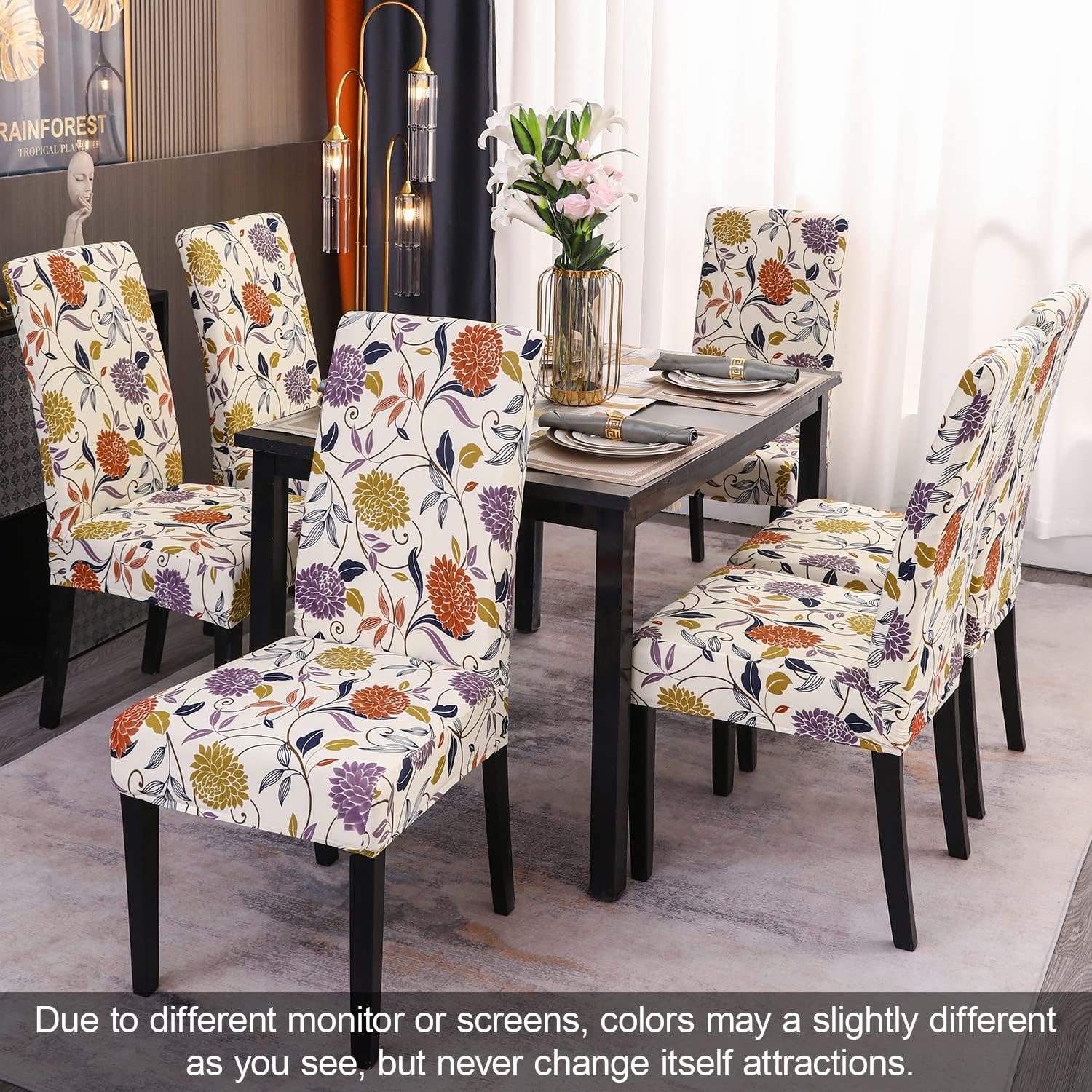 • 【High Quality of Chair Cover】- JQinHome dining room chair coversare made of durable and high persistence polyester and stretchy spandex fabric, soft, comfortable and wrinkle resistant, no ironing required; Stretchable Material,stretch that recovers quickly,secure fit with sewn-in elastic hem.