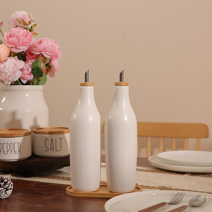 • KITCHEN OLIVE OIL DISPENSER - 16.9 fluid ounce (500 ml) Ceramic olive oil dispenser bottle with bamboo cap and stainless steel cruet spout, Works great as a kitchen oil dispenser for Olive Oil, Vinegar, syrups and more.