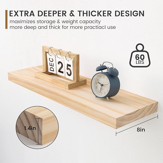 • Extra Deeper & Thicker for Storage - Each board measures 24"W x 8"D x 1.4"H. Extra deeper and thicker design in order to bring maximizes storage space and weight capacity, even hold up to 60 lb. This floating shelf taking up zero square feet, reduces clutter and highlights décor in compact spaces. It can help make full use of the empty wall, making it much more space-saving and making your room look larger and tidier.
