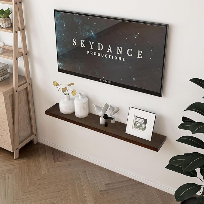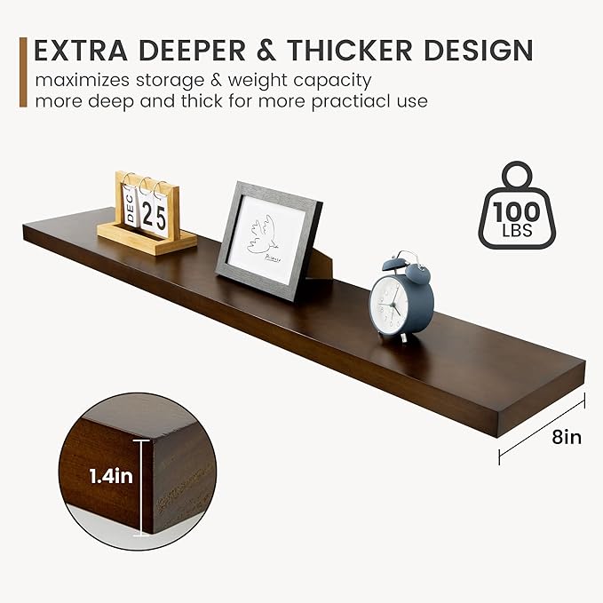 • Extra Deeper & Thicker for Storage - Each board measures 48"W x 8"D x 1.4"H. Extra deeper and thicker design in order to bring maximizes storage space and weight capacity, even hold up to 60 lb. This floating shelf taking up zero square feet, reduces clutter and highlights décor in compact spaces. It can help make full use of the empty wall, making it much more space-saving and making your room look larger and tidier.