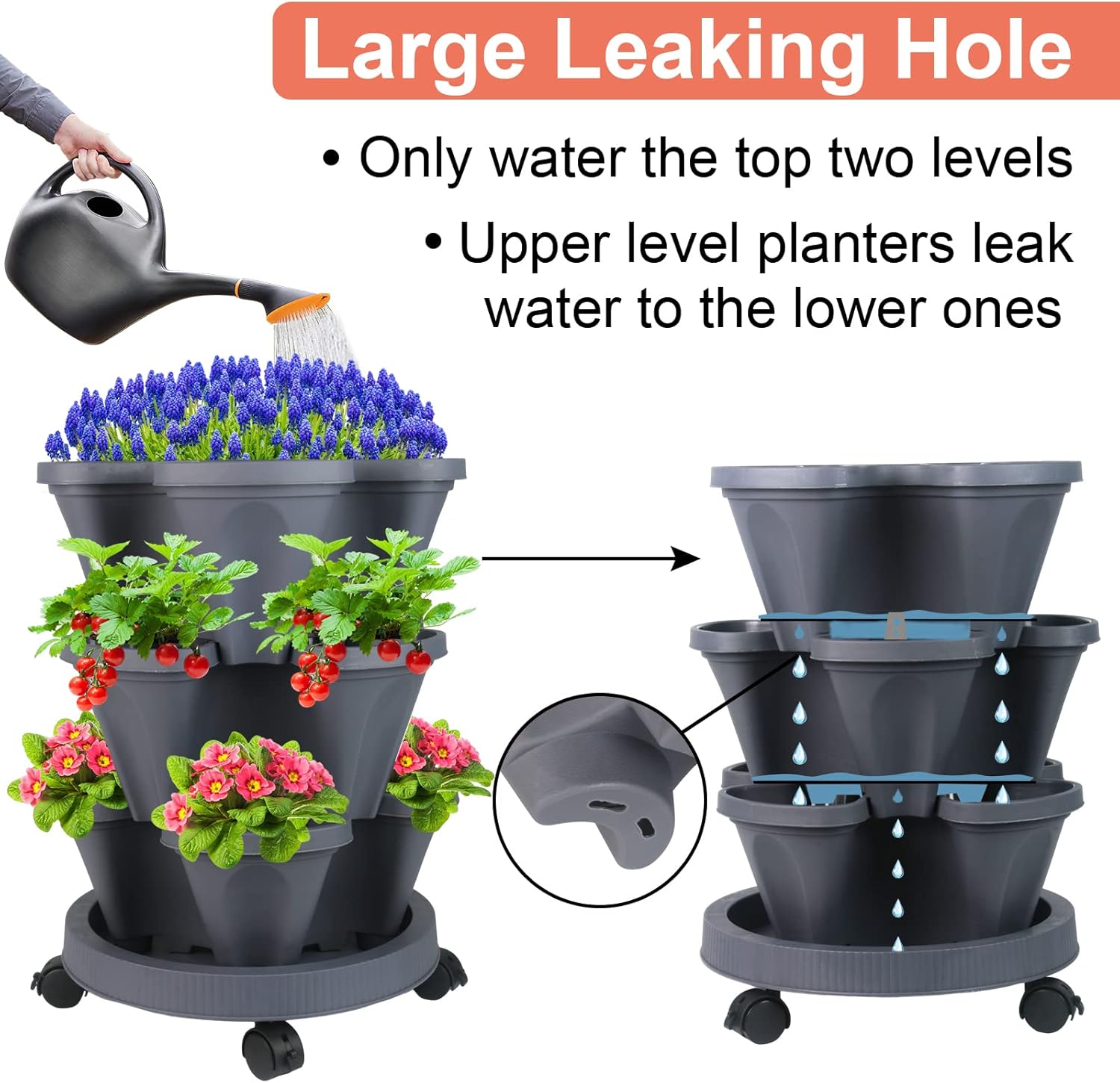 DUNCHATY Stackable Planter, Vertical Garden Planter with Wheels and Tools, Self Watering Strawberry Planter Indoor/Outdoor 3 Tier Herb Planter Pots for Growing Vegetables and Succulents, Dark Gray