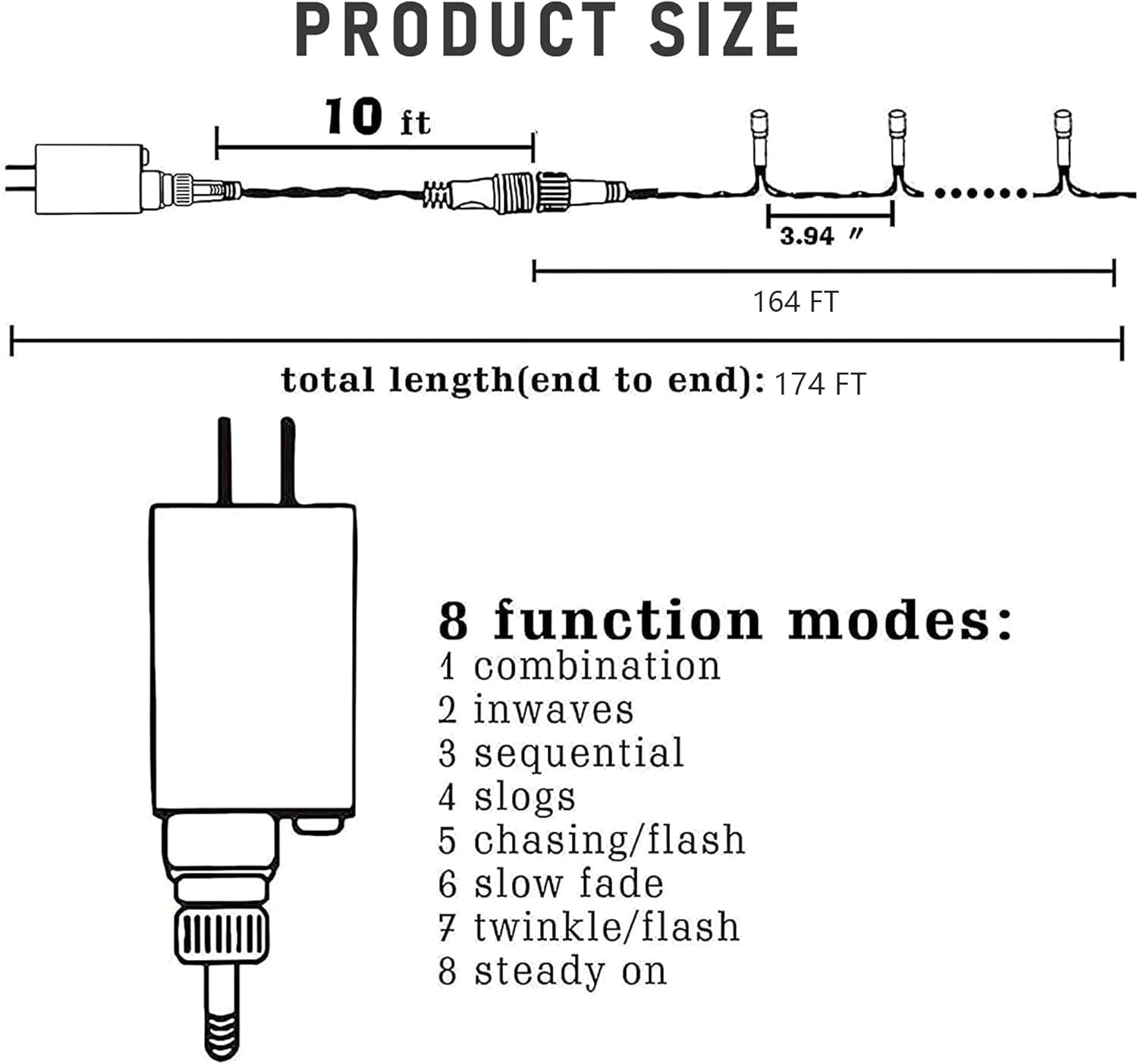• Specification: Halloween 500 LED string lights, The outdoor lights has 10 FT leading wire, and the light string is 164 FT, total length is 174 FT, the bulb spacing is 3.94 inch.