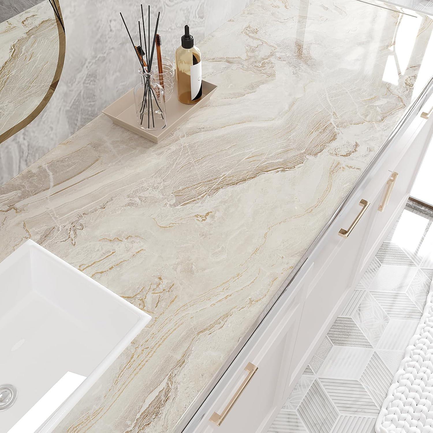 • SIZE& MATERIAL: This marble countertop contact paper is 15.7 inches wide by 354 inches long, coverage in 38.75 square feet each roll. Made of high quality vinyl, thick, durable, matte finish, elegant beige gold marble look