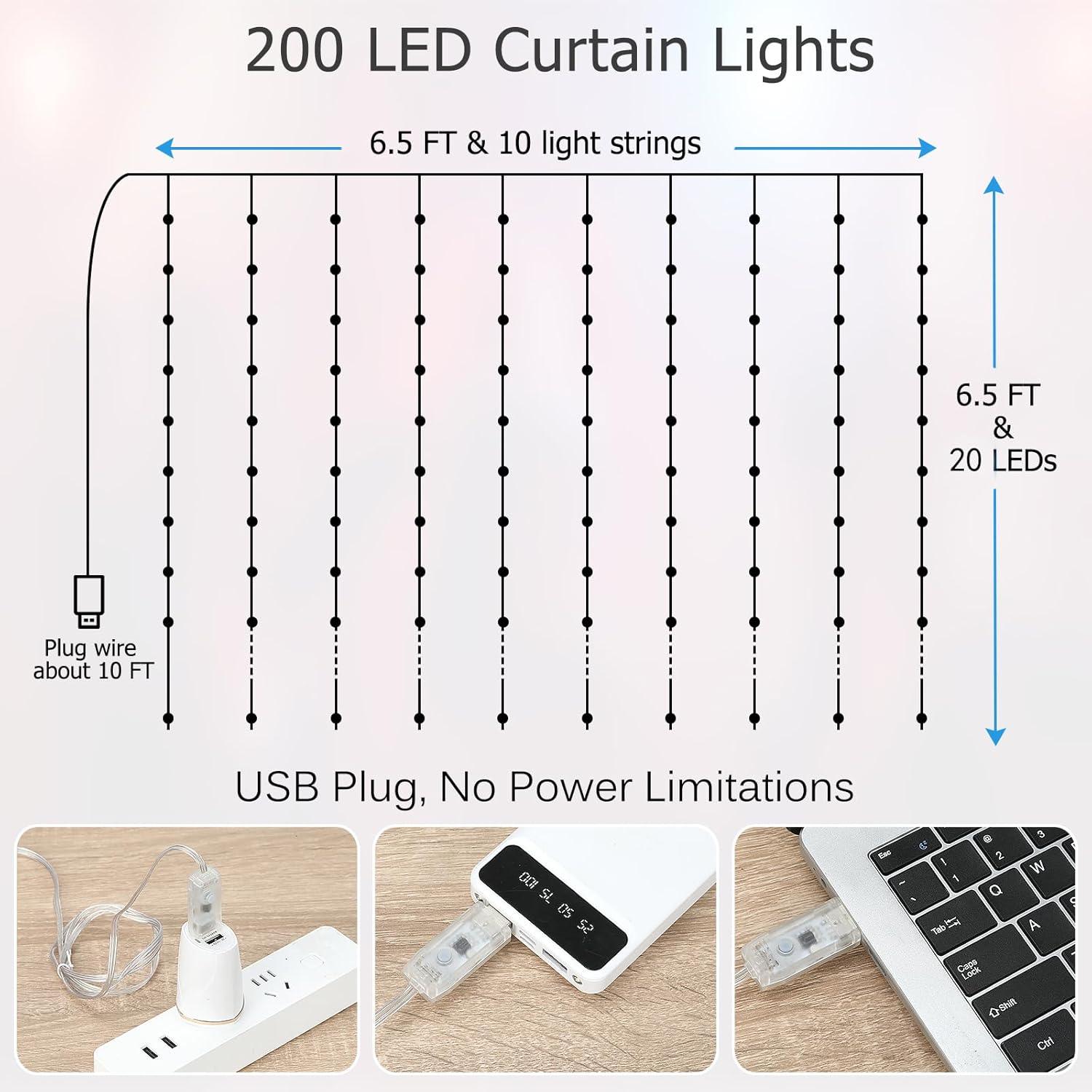 • Safe & Easy to Install: USB power means you can use window curtain lights anywhere, indoors and outdoors,plug in various USB power output device,such as USB charger, powerbank, laptop etc; With 10 equipped hooks, simple to hang it on any surface.