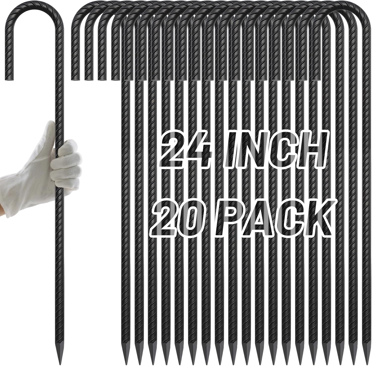 • PACKAGE INCLUDED - Set of 20 Steel rebar ground anchor stakes. Each J Hook stake is approximately 24" long; 0.47" (12mm)diameter;And hook is 5.12" (13cm) in length 2.48" (6.3cm) in diameter.The stakes has an extra-long length and a thickness that benefits, which means it can be inserted deeper and fixed more firmly.