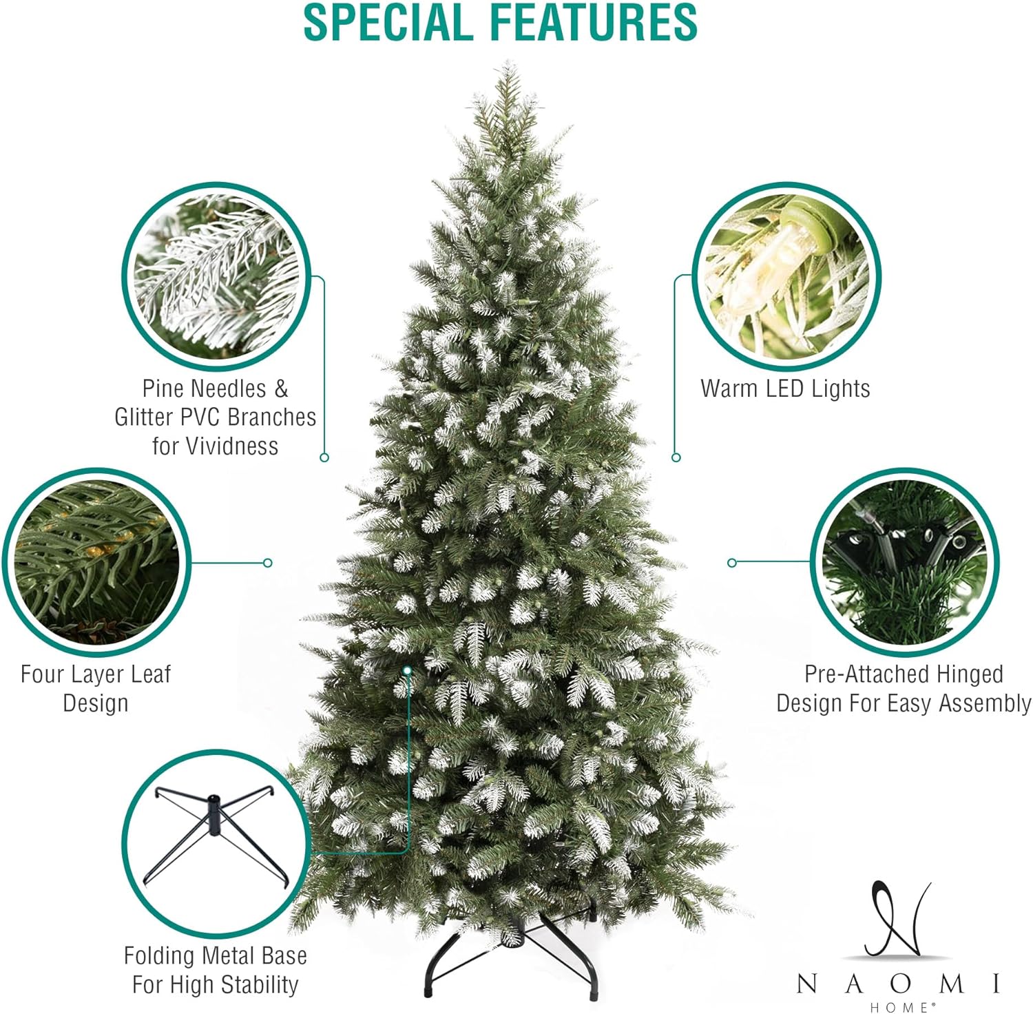 Naomi Home 6.5ft White Tip Christmas Tree with Lights, Realistic Light Snow Flocked Fir Prelit with 1292 Branch Tips, 350 Warm Lights and Metal Stand, Aritificial Tree