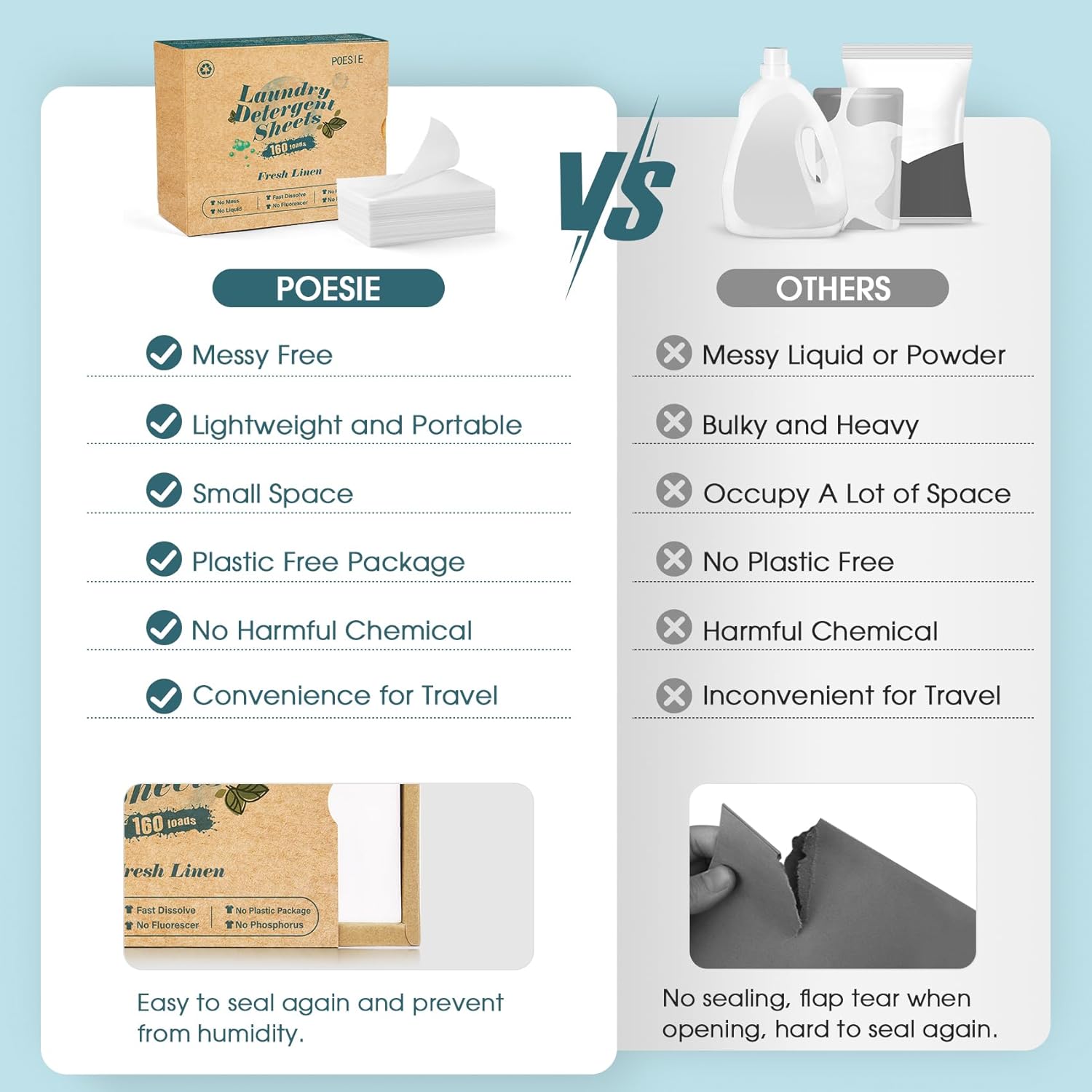 Poesie Laundry Detergent Sheets Fresh Linen Scent 3 Pack 480 Strips Plastic Free Fast Dissolve Washing for All Washing Machine Traveling Dorm Life Save Space
