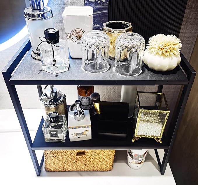 • Modern and Multi-Functional: The sleek satin black finish and tiered design make this shelf an excellent home decor piece that can be used as a cosmetic organizer, spice rack, or stylish display in any room