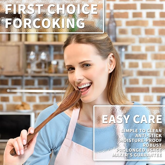 • NATURAL TEAK WOOD: Crafted from solid teak wood, our utensil set is 100% handmade and eco-friendly. It's durable and crack-free, unlike silicone or bamboo alternatives. Note: Natural wood utensils may have slight color variations.