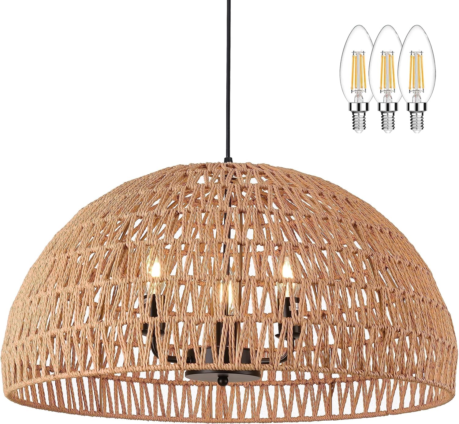 • [Bulbs Included & Dimmable]: Includes 3 regular warm white bulbs with E12 bases. When you buy other dimmable bulbs and combine it with a wall dimmer it can be fully dimmable. The bulb bases have a maximum power of 60W and this wicker pendant has a adjustable hanging rope length so you can use this fixture with confidence.