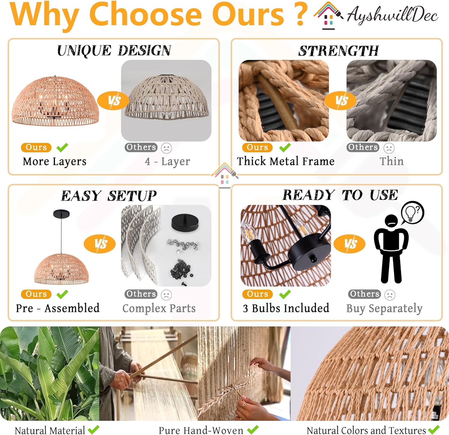 • [Unique style] This brown woven chandelier is woven with hemp rope. When switched on, the light emits a soft and pleasing glow through the hemp rope, bringing a relaxing and cosy ambience to any part of your home and will give you a different kind of surprise.