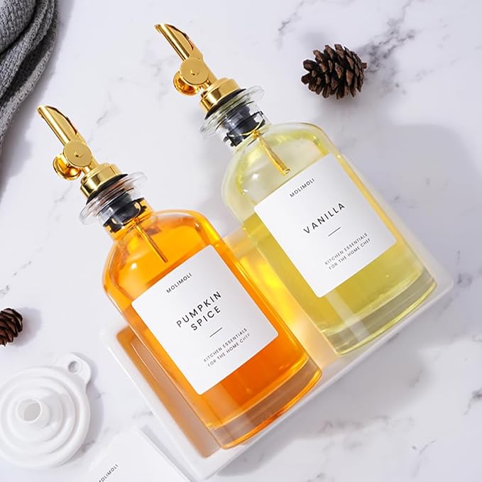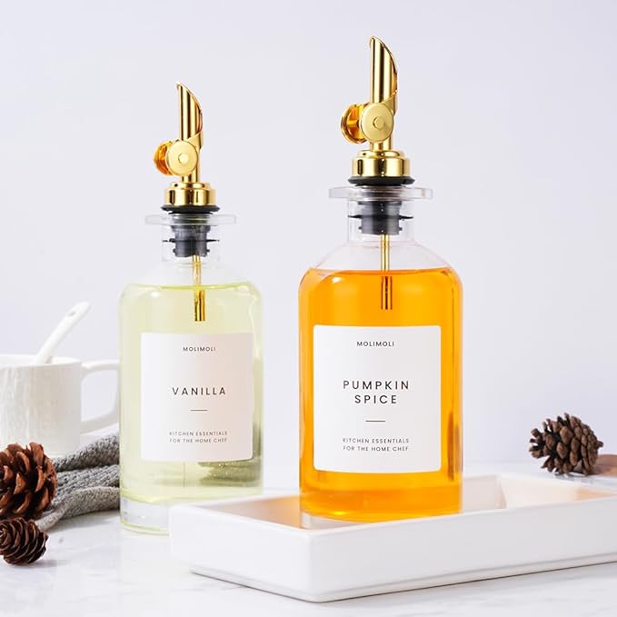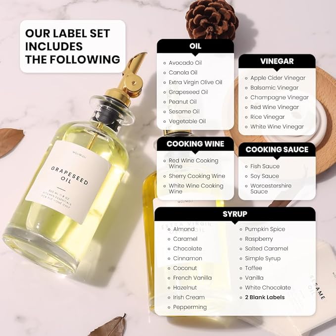 • Modern Kitchen Essential: Minimalism Inspired Cooking Oil Dispenser Bottle. This Set Includes Two High-quality 11.8 Oz (350 Ml) Glass Bottles, Two Gold Pourers, a funnel, and a 37 Label Set.