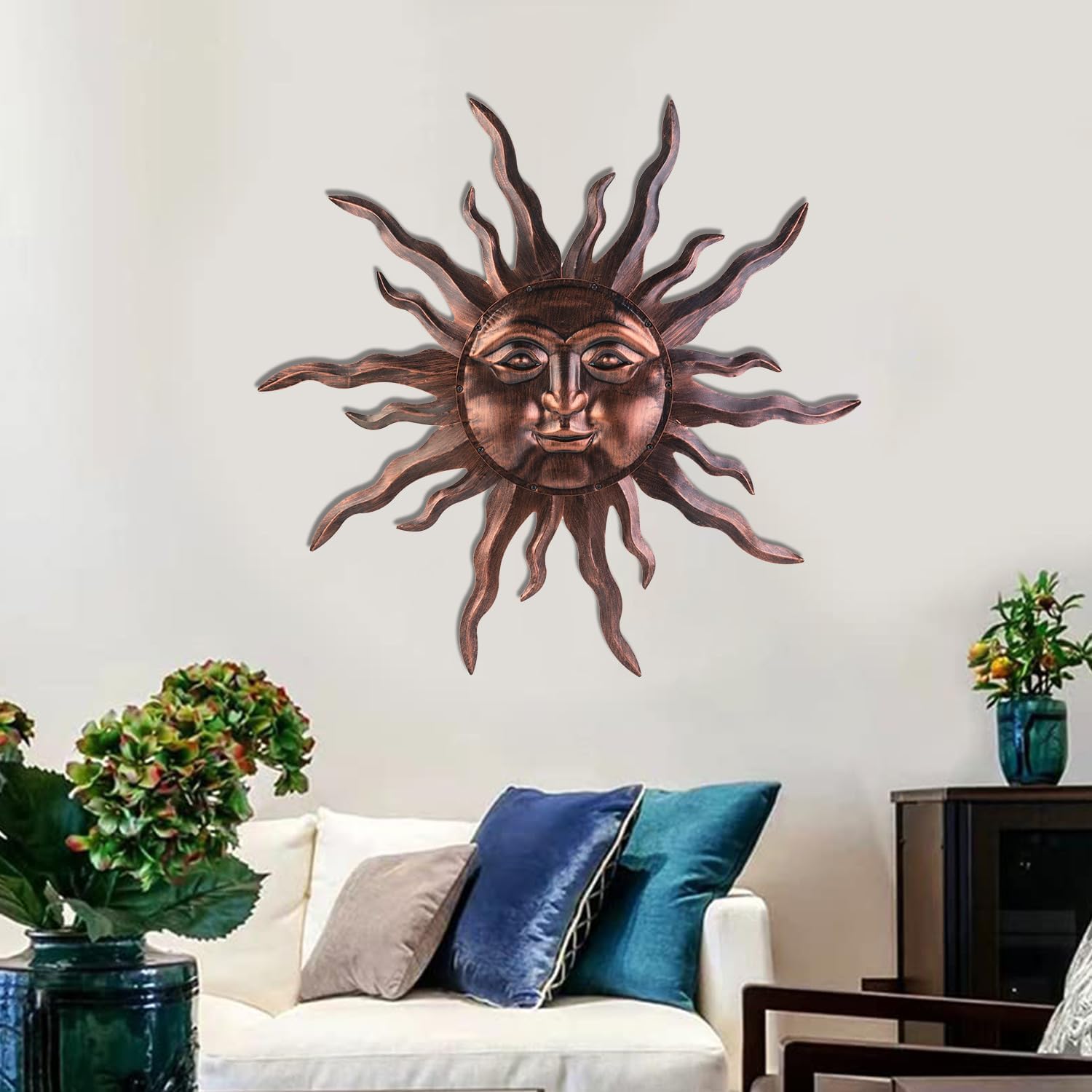 VZVXCC Large Metal Sun Wall Art Decor- 30 inches Sun Wall Hanging Decoration for Indoor Outdoor, 3D Sunshine Face Metal Wall Sculpture for Home Bedroom Living Room Office Garden Yard Patio(Bronze)