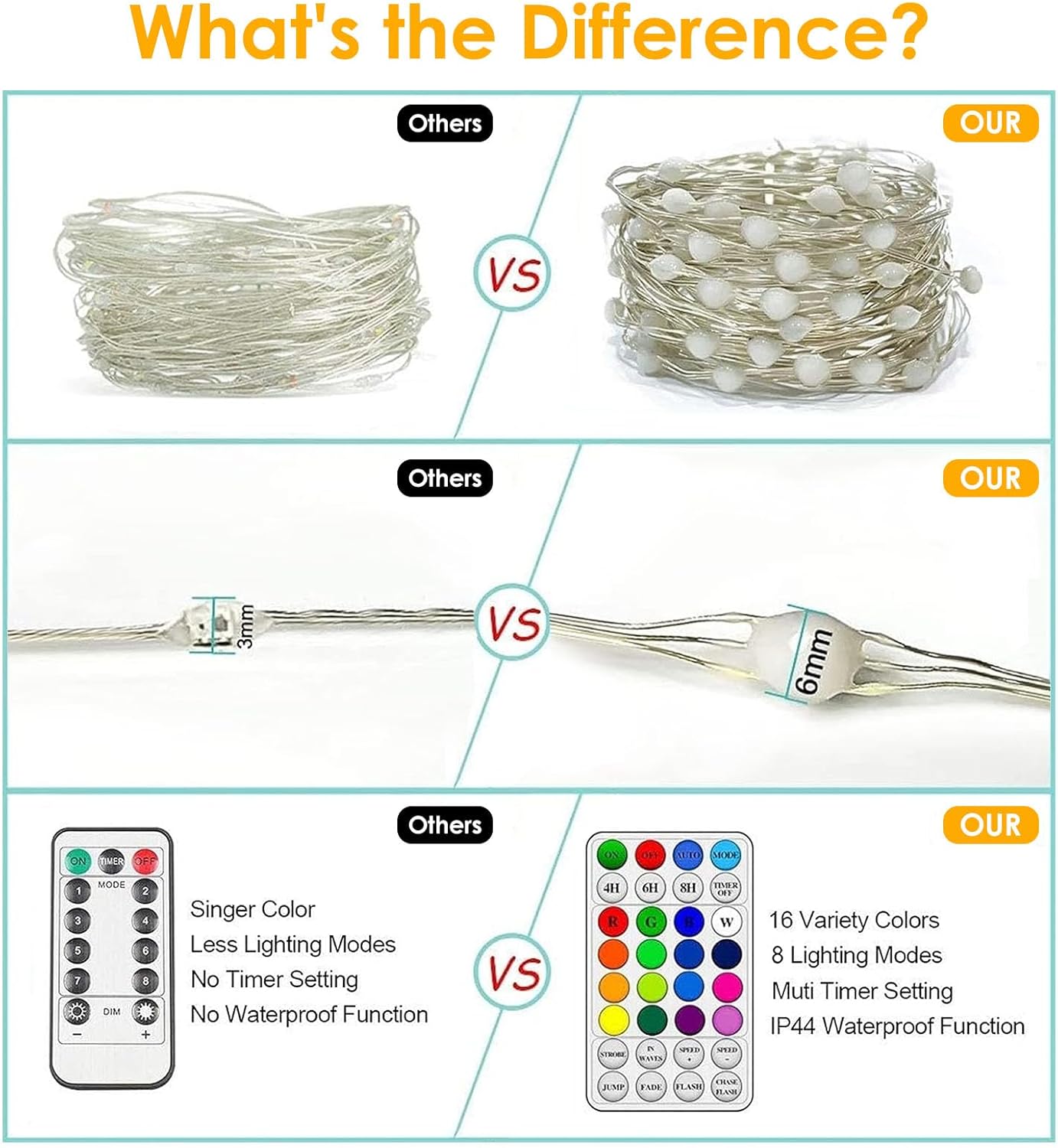 • Upgraded Twinkle Lights USB Operated: This fairy string light comes with a remote, providing 16 color variations for various occations. Effortlessly set your preferred colors for any occasion and relish its enchanting decorative effects. Decorate indoor scenes with different solid colors and colorful lighting effects