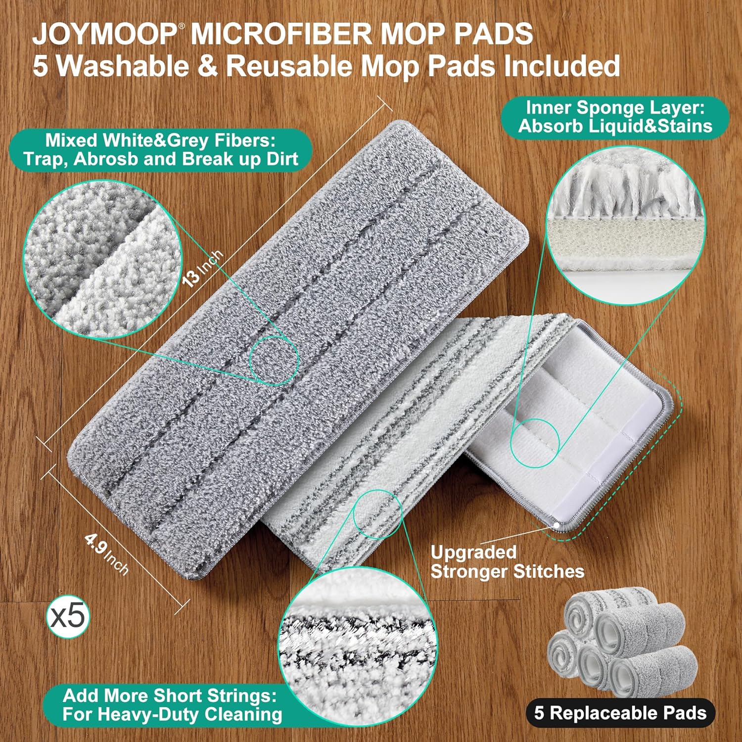 • [Reusable Cleaning Microfiber Cloths] Applied to a 13.0 by 4.9-inch mop head. 5 microfiber mop pad refills come with this set. Strong water absorption lets you easily do any wet and dry cleaning. To keep long-term usability, recommend changing refills every 1-2 months based on usage frequency