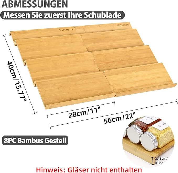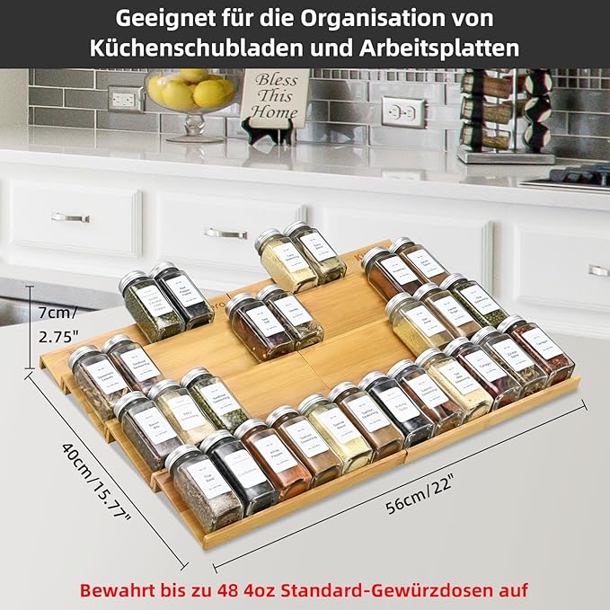 • Perfect Size: Spice rack organizer for drawer MIN size: 22" wide x 15.8" deep x 2.75" high, standard 4 oz spice jars fit easily into the drawer sliding and closing completely.please measure your drawer before ordering!