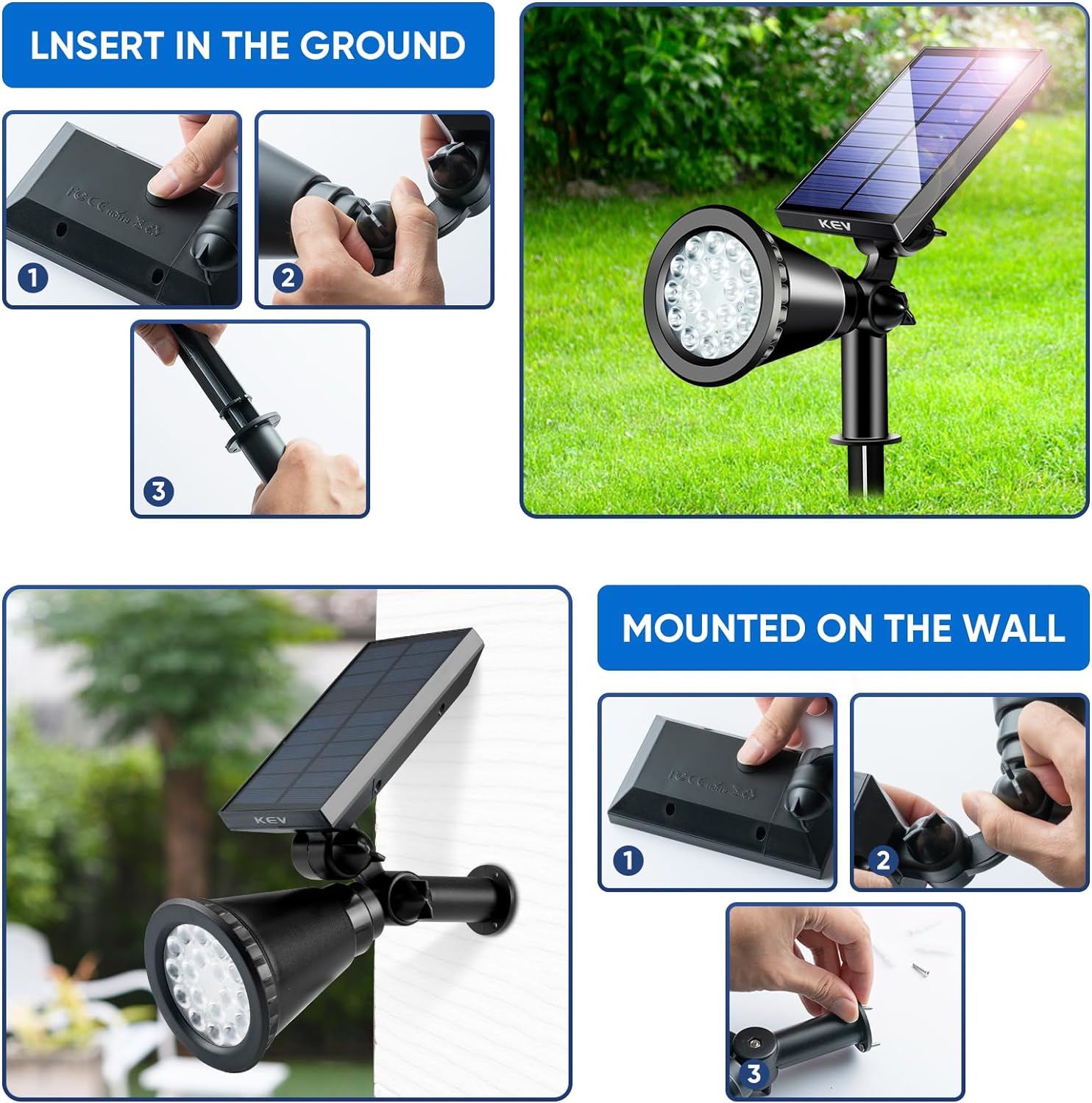• 【2 Ways of Easy Installation】Stick into the ground by stakes,or mount on the wall by screws.These outdoor Solar Lights to highlight the trees,statue,signpost,pool, Also as Solar Wall Lights to light up your front door,driveway,pathway.