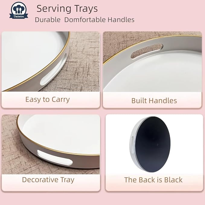 13" Round Decorative Tray, White Serving Tray with Handles, Plastic Coffee Table Tray for Ottoman, Living Room, Bathroom, Décor.