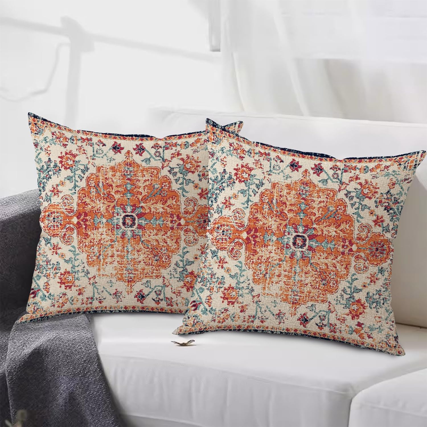 Outdoor Waterproof Pillow Covers 16X16 Inch Set of 2 - Bohemian Vintage Carpet Pattern Orange Blue Ethnic Design Decorative Farmhouse for Couch Garden Balcony