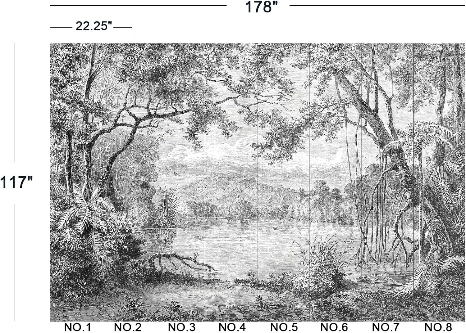 • The size of the wallpaper is 178" wide x 117" high and divided into 8 panels.