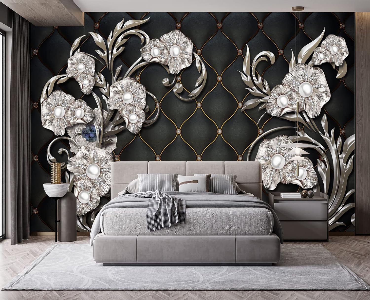 Black Hard Wrapped Pearl Embossed Flowers Wall Mural Wallpaper for Bedroom 103" x 69"