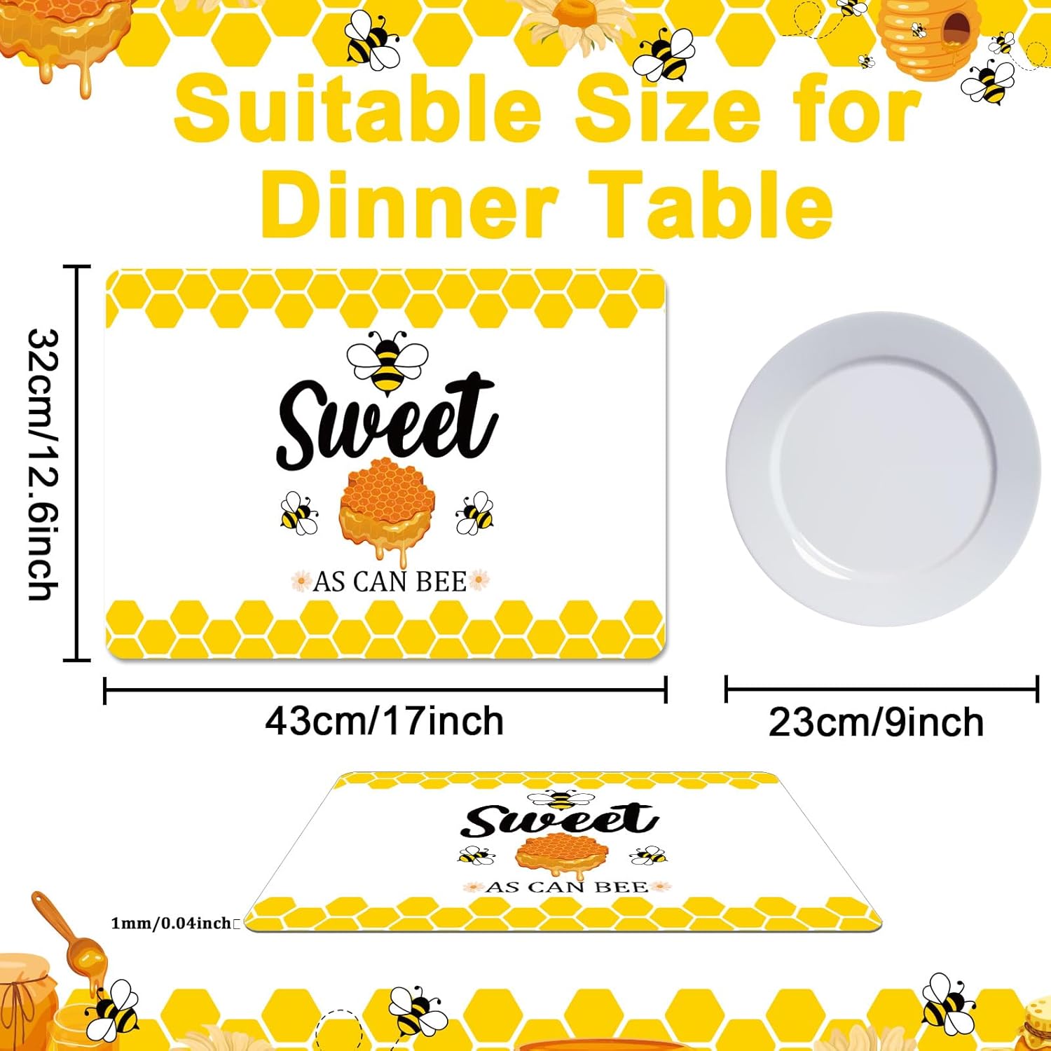 • 【Honey Bee Placemats】You will receive 6 pieces bee plastic placemats. Measuring at 17.0 x 13.0 inches/43 x 32cm, honey bee table mats are the ideal size to accommodate your bee themed party or gathering. With a sufficient quantity and perfectly sized dimensions,cute bee place mats are sure to be a hit at your event.
