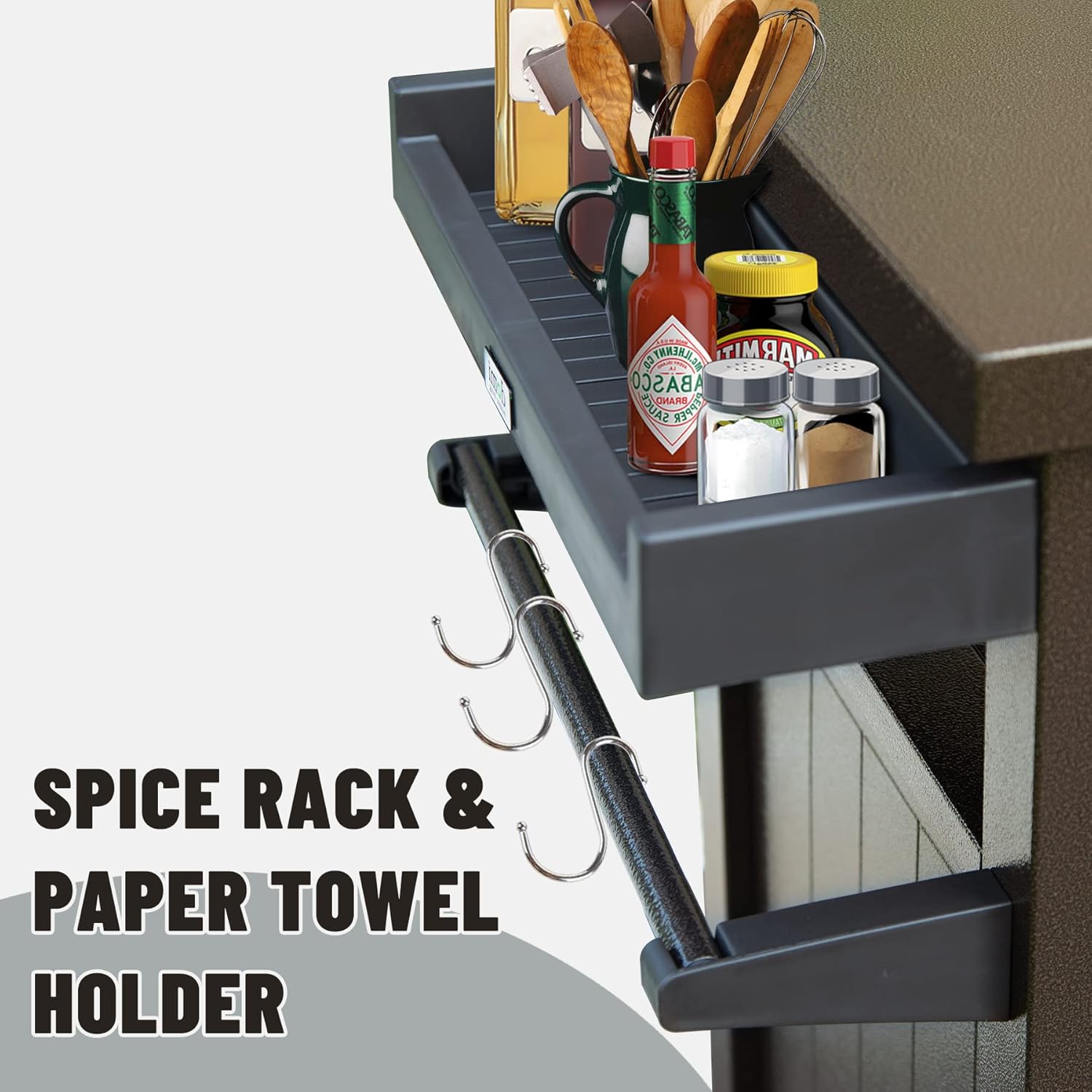 • HUMANITY DESIGN: Includes two side bars for paper towel or hook holder without hook hangers, spice rack, Lockable storage space. Place as more tools as you want.