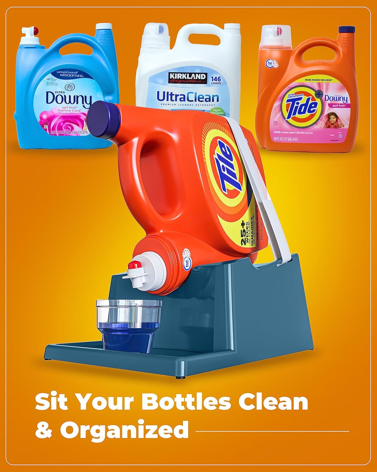 • [Versatile Fit:] The liquid laundry detergent holder station's optimal size (7.9"L x 12.2"W x 5.5"H) accommodates various bottle sizes, providing a perfect fit for most detergent containers without taking up too much space. (Laundry Soap, Cup, and Bottles NOT Included)