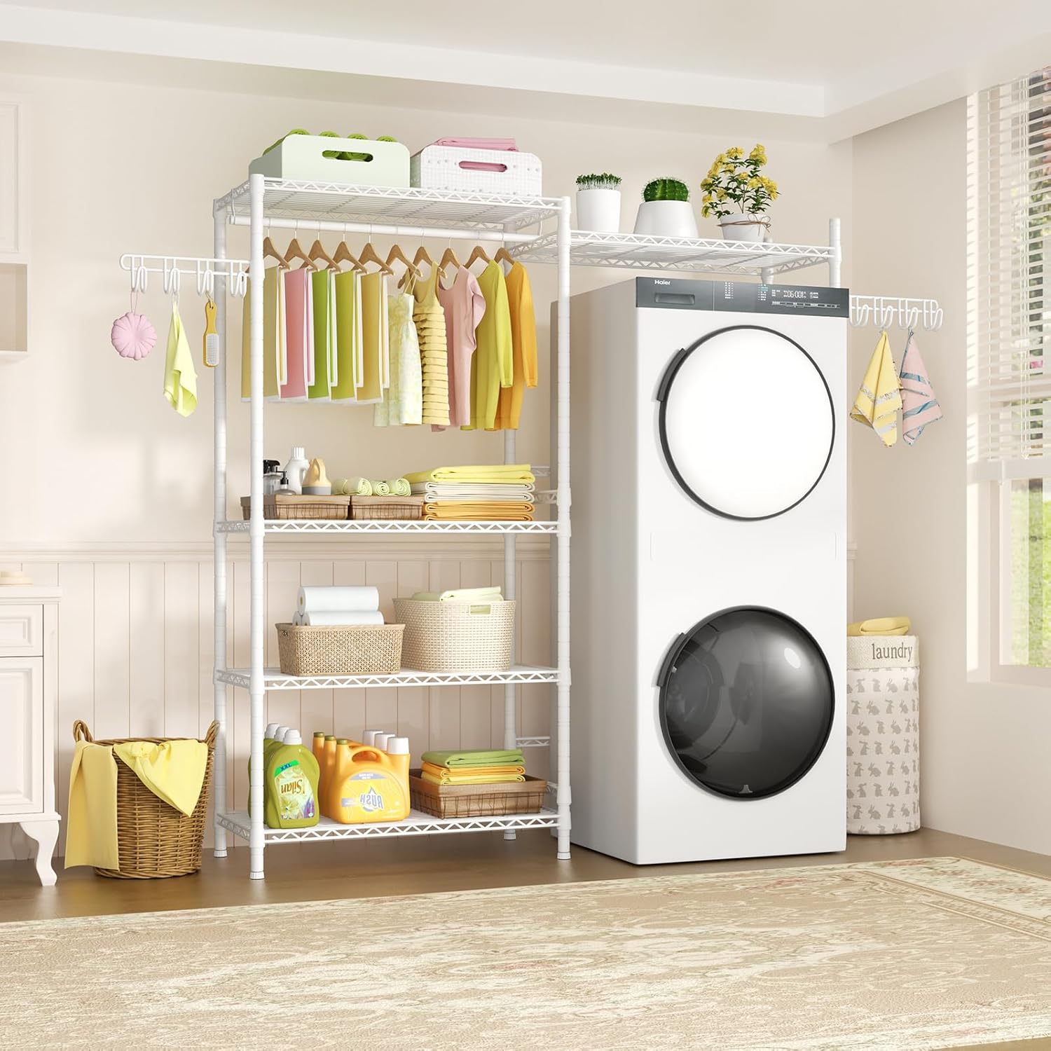 Ulif U5 Over the Washer and Dryer Storage Shelf, Laundry Room Space Saver Bathroom Storage and Organizer Rack for Hanging Towels and Drying Clothes with 5 Wire Shelves, 58.2"W x 13.4"D x 77.5"H, White
