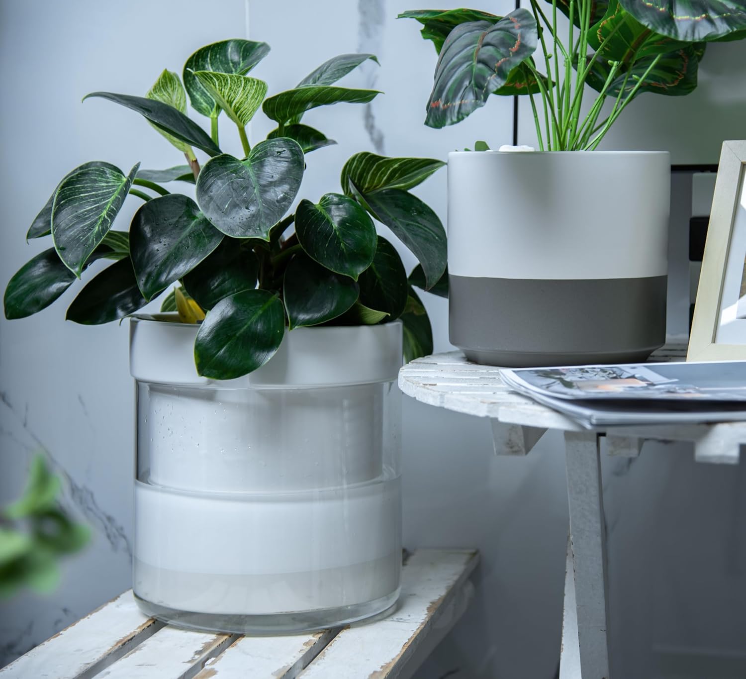 Phoenix Vine 10 Inch Self Watering Planter, White Terracotta Clay Pot with Glass Reservoir for Indoor Plants, Herbs, Flowers, Set of 1, 52-B-I-1