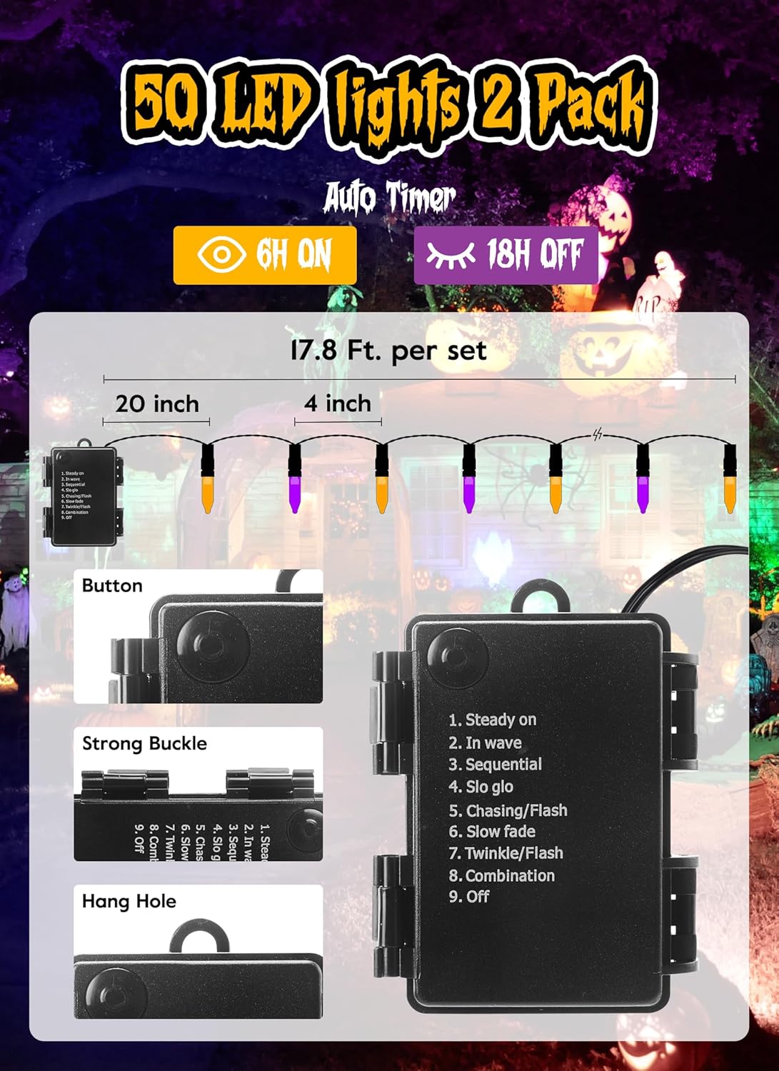 • 【Timer Lighting】Press the button on the halloween lights battery case to power on, and to activate 6 hours lighting and 18 hours off mode, no worrying about forgetting to switch off the lights, 20000 hours LED lifespan for endurable operation