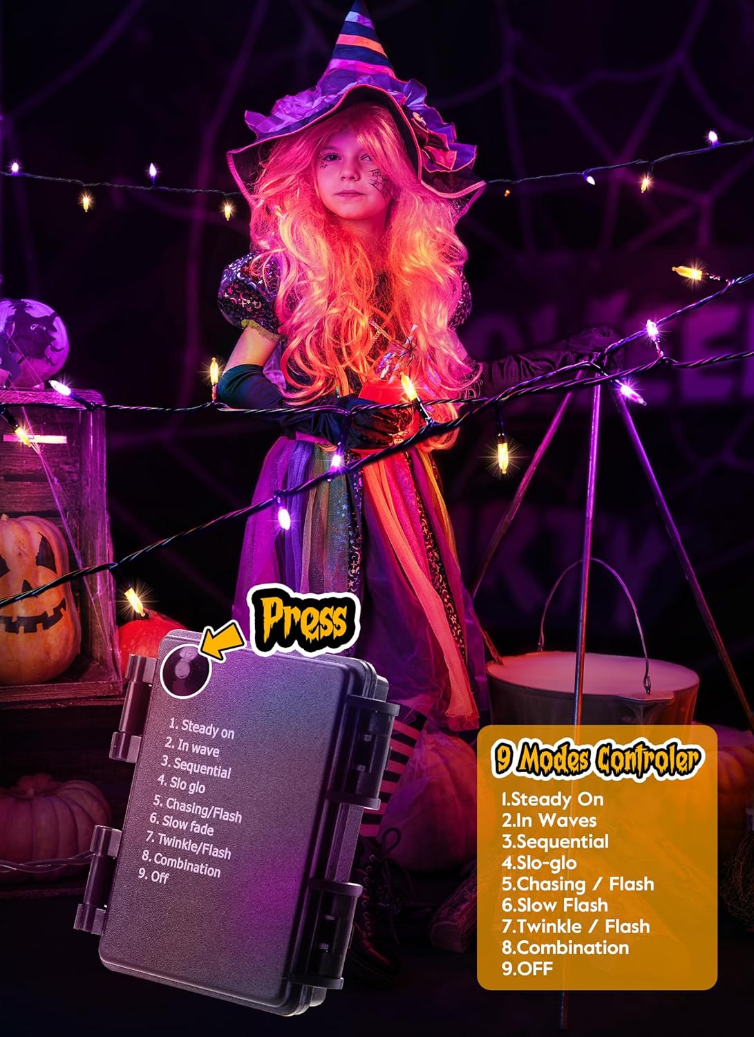 • 【8 Preset Modes】Fantastic lighting effects of these Halloween lights, adapting to desired occasions or events: press the button on the control box repeatedly to select 1. steady on, 2. in wave, 3. sequential, 4. slow-glow, 5. chasing/flash, 6. slow fade, 7. twinkle/flash or 8. combination