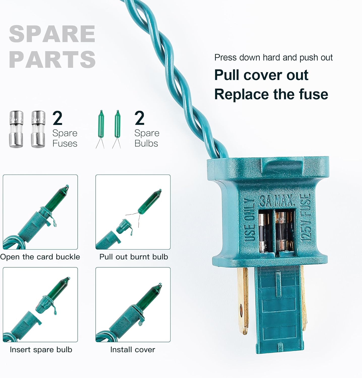 • 🌲Safe to Use : 50count green Christmas string lights are UL certified and the quality is guaranteed. Our Christmas strings lights have built-in fuses, which will protect the short circuit caused by the damaged wire and can effectively prevent the possibility of fire. High quality use rest assured. Warm tips: Please kindly protect these string lights from immersing in water and keep the plug dry.