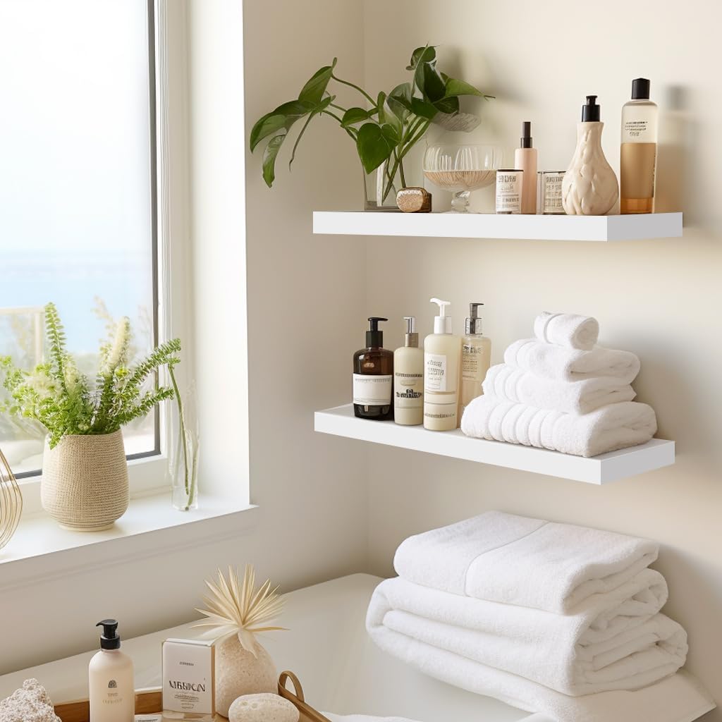 LaVie Home Floating Shelves, 15.6 Inch Wall Shelf Set of 3, Hanging Shelf with Invisible Brackets, Wall Decor for Bathroom, Bedroom, Living Room, Kitchen Storage, Modern White