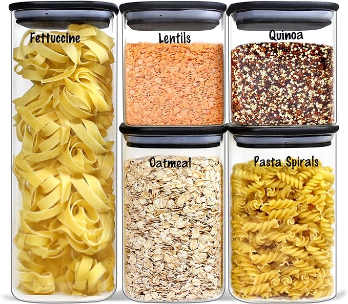 • ✅ NEW STYLISH BLACK LID SQUARE SHAPE: Looking for black and white, cool and stylish home deco? These Urban Green glass food storage canister sets with black lids are perfect for contemporary pantry design. We carefully selected 5 different sizes from 6oz to 100oz that can store any dry food, such as pasta, beans, nuts, cookies, spice or flour. Try our black lids glass jars for a new modern pantry organization.