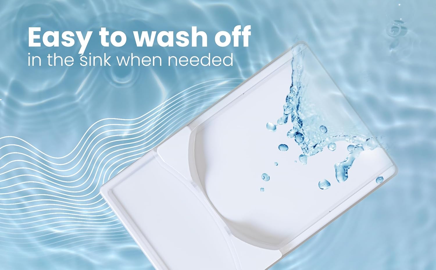 • [MATERIAL] - This Angled Laundry Detergent Holder is made of Plastic with a molded edge to keep the measuring cup from sliding or falling off the platform to prevent the soap or detergent from dripping onto the shelves or floor. There's also a "Rubber" in his feet to secure the soap station firmly in its place