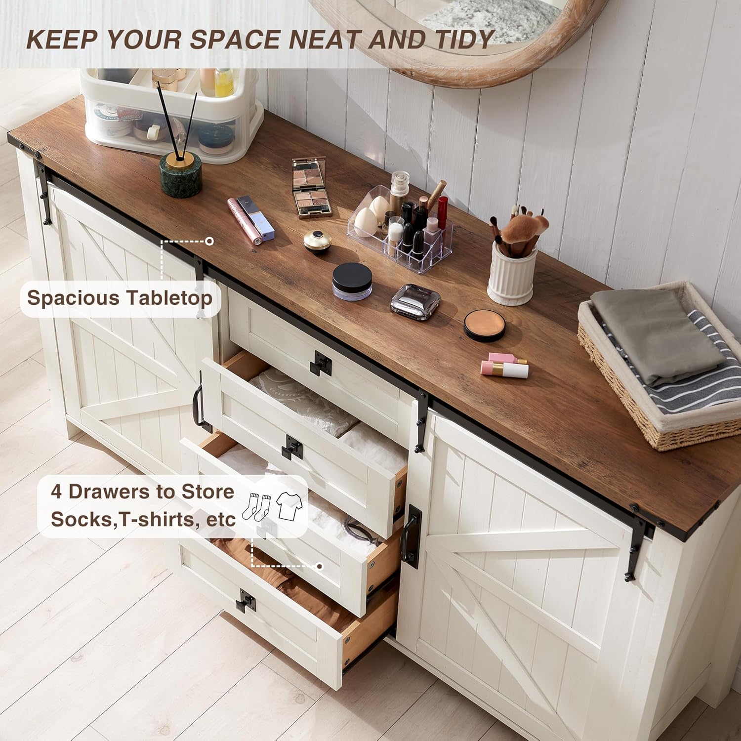 T4TREAM 60'' Farmhouse Dresser Chests for Bedroom w/4 Drawers & Sliding Barn Doors, Tall Chest of Drawers, Rustic Dresser TV Stand, Organizer for Bedroom, Living Room, Kitchen, Antique White