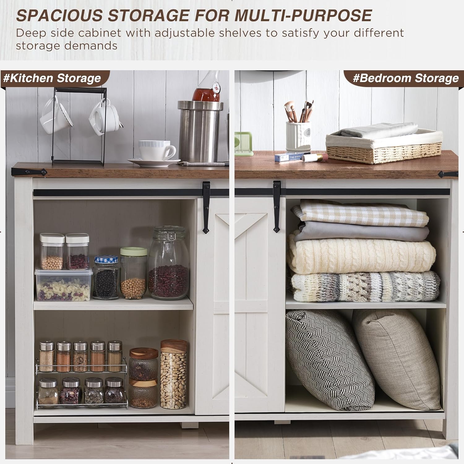 • SLIDING BARN DOORS: The farmhouse space-saving barn door slides open on a metal track to reveal adjustable shelf space, allowing you to freely hide or show storage spaces. The shelf with 3 height adjustable and is also removable enabling flexible storage of different-sized items. The smooth-glide track makes it convenient for people of all ages and abilities to open and close with minimal effort. The dresser with sliding barn doors can be particularly beneficial to maintain a clutter-free and organized look.