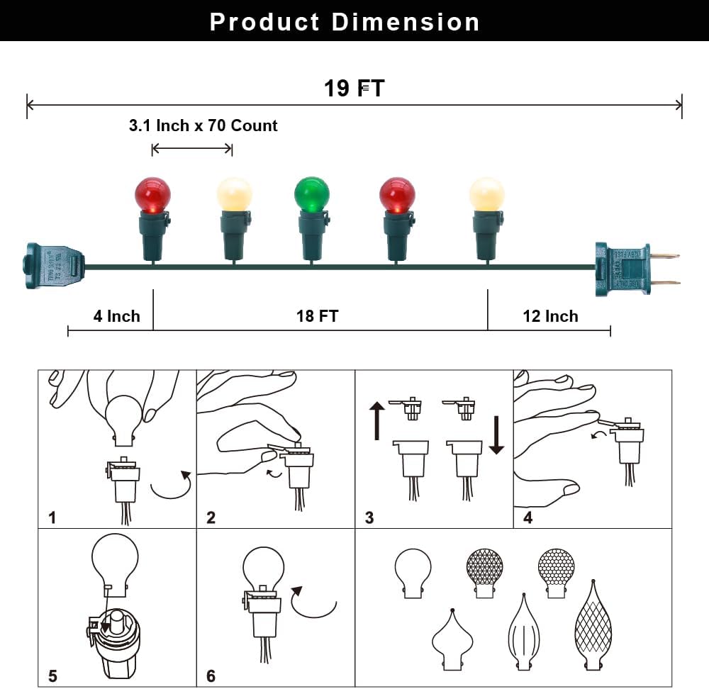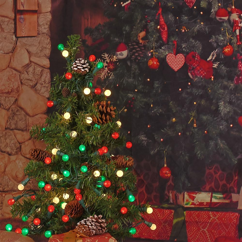 • Red Green White G15 Christmas lights : Totally 19Feet & 70 Mini Globe Round Bulb Lights . LED bulbs always cool to the touch when lit. If one bulb burns out the rest will stay lit. LED lights use up to 80% less power than incandescent bulbs.