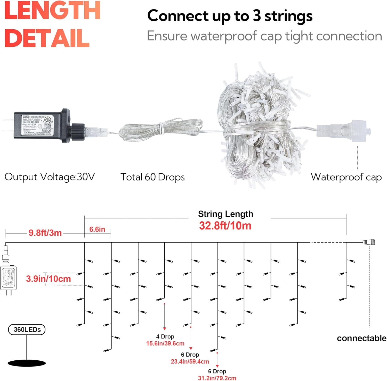 • 💝【Led Christmas Icicle Lights】:Hopolon icicle Christmas lights adopt 360L bright led bulbs,42.6ft total length(Wire with light 32.8ft+Lead wire 9.8ft) with 60 drops.Drop lengths 16''- 24''- 31''- 24'', number of light bulbs is 4, 6, 8, and 6 respectively.Hanging our red icicle christmas lights to create warm and romantic atmosphere for you.