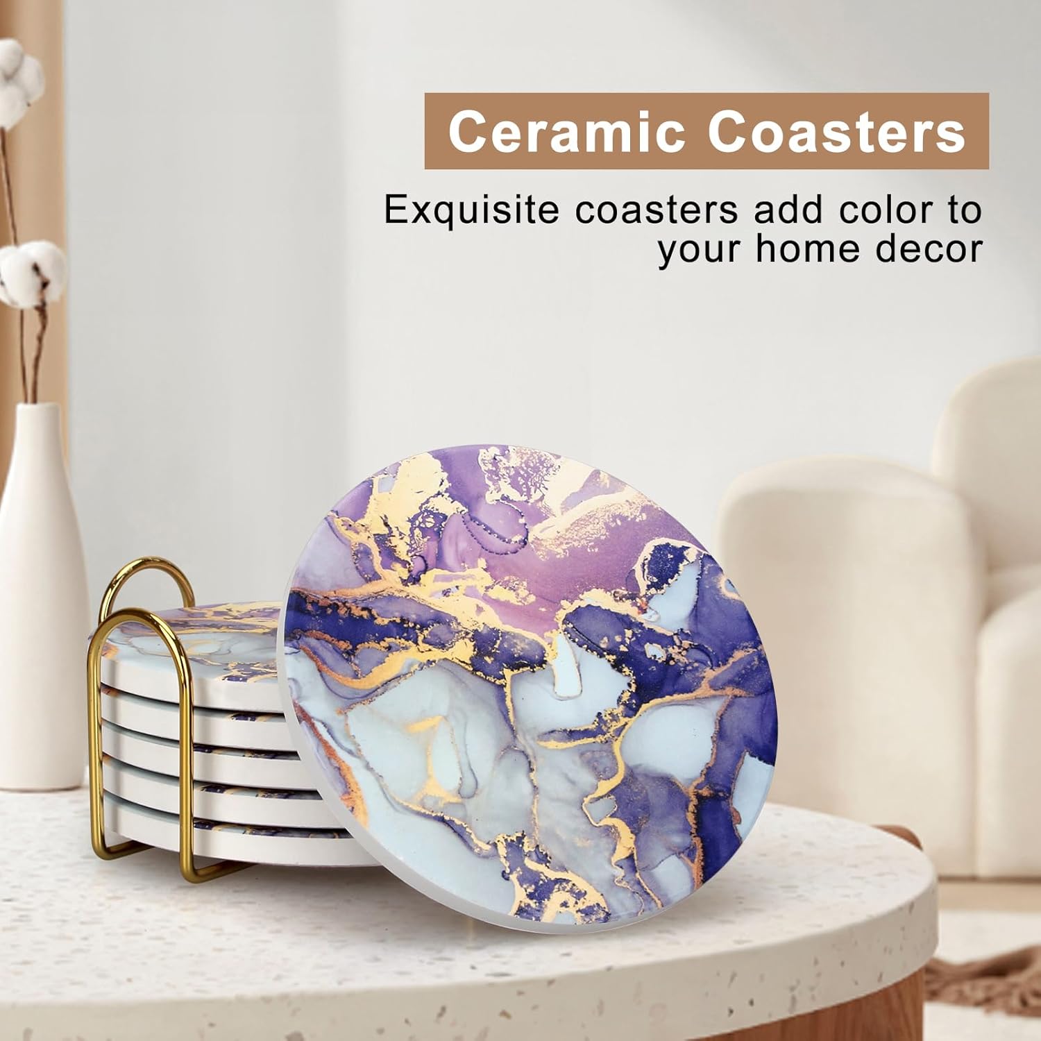 • COASTER SET WITH HOLDER: This drink marble coaster set comes with 6 ceramic stone coasters. Plus, the gold iron coaster holder keeps your coasters organized and saves space.