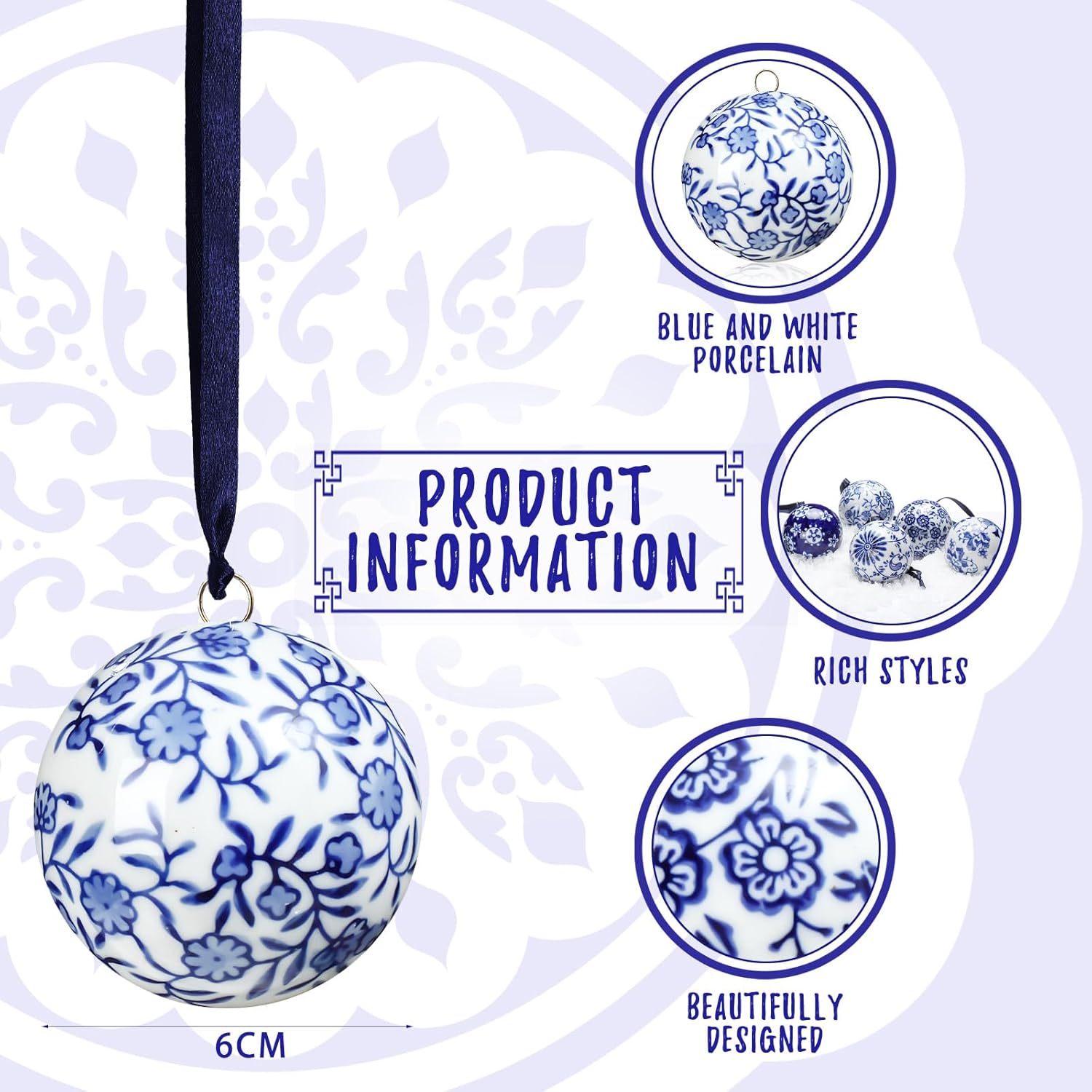 • 6 Pcs Porcelain Orbs: the set of decorative porcelain balls ornaments has a total of 6 pieces of balls in 6 different patterns and styles, each with a size of 2.4 inches/ 6 cm in diameter; The sufficient quantity and the rich styles can meet your use and share needs in daily life or other festivals