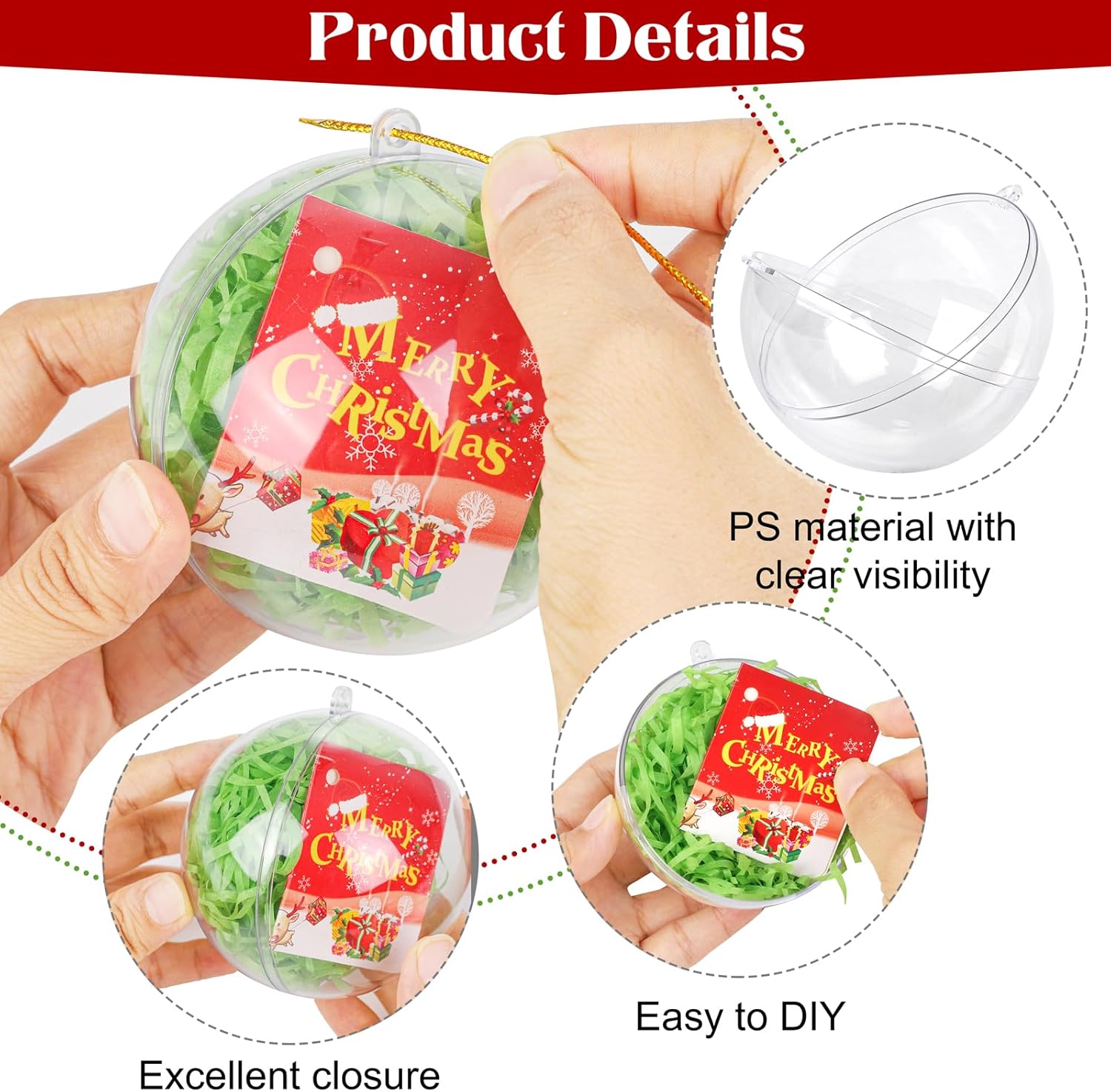 • Versatile application: these Christmas clear plastic fillable ball ornaments have a wide range of uses and can be customized according to the unique characteristics of different festivals, such as Christmas, weddings, New Year's celebrations, and other festive events; these filling Christmas balls are ideal for decorating Christmas trees, fireplaces, staircase railings, storefront displays, indoor and outdoor holiday decorations, gift packaging, candy packaging, and more