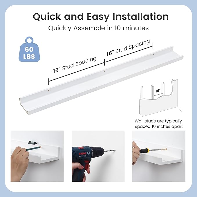 • Easy to Install: You will get a level, screws for the wall, drywall anchors, a detailed installation guide, and two beautiful hand-crafted solid pine wood shelves. With the level, you can make sure your picture ledge shelves are well aligned. Just follow the simple instruction to install the hanging shelves for wall decor within 10 minutes. We add additional screw and anchor to the hardware bag just in case. If you have any questions about our products, please feel free to contact us