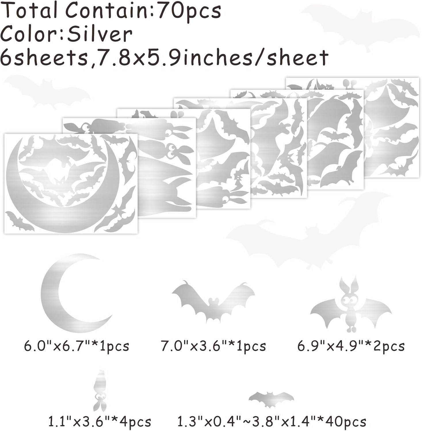 • Bats mirror stickers include :7.8 x 5.9 inches /sheet , 6 sheets, (moon size :6.0’’x6.7’’x1pcs,bats size : 7.0’’x3.6’’~1.3’’x0.6’’x69pcs).