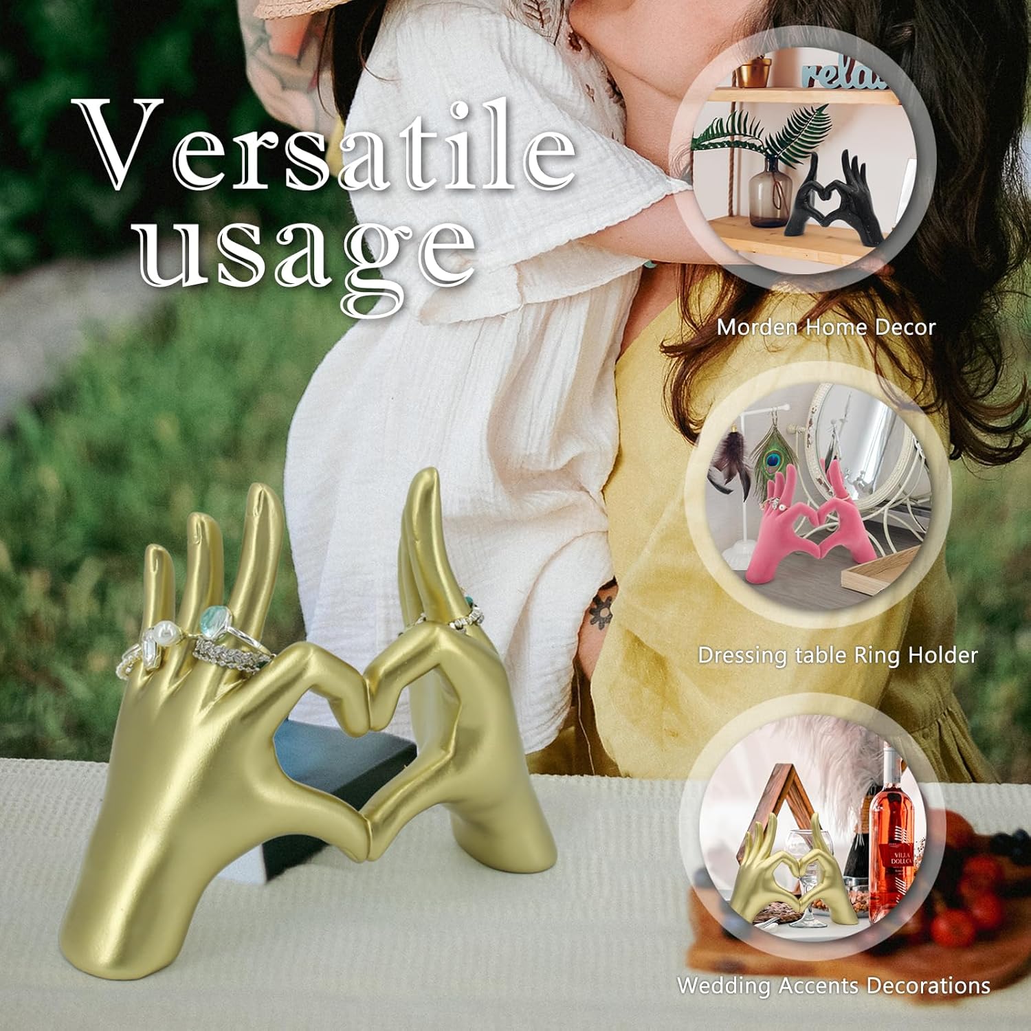 • I love you hand sculpture:The gold heart hand ring holder makes a perfect present for jewelry enthusiasts girl, collectors, Mothers Day presents for Mom, or anyone who appreciates exquisite craftsmanship. Its unique design and practical functionality will impress and delight recipients on birthdays, anniversaries, Valentine's Day decor,or other special occasions. This display stand not only showcases rings but also symbolizes love and warmth, making it a thoughtful and heartfelt present